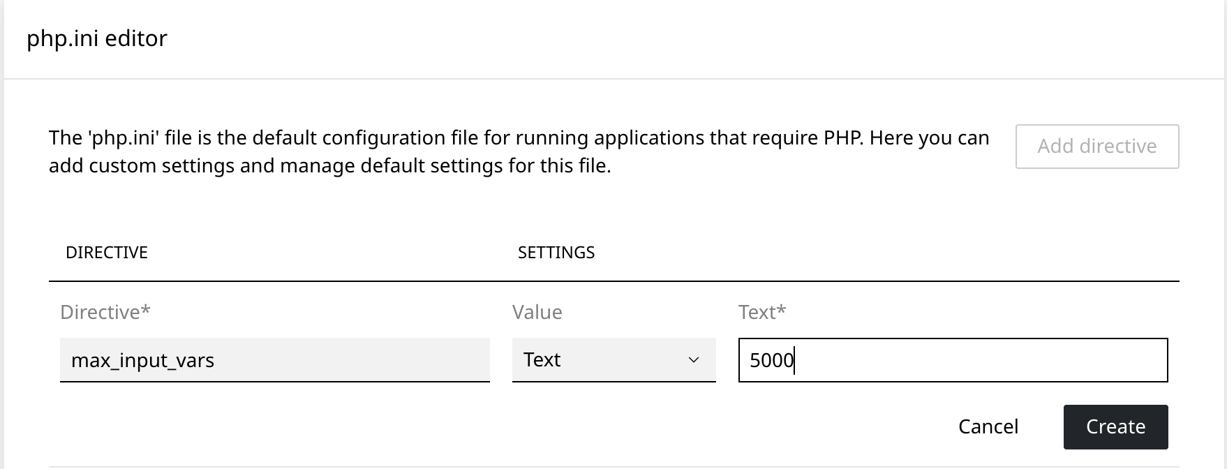 5. Enter "max_input_vars" into the Directive field and the desired memory size in the Text field. eg. 1000, 5000, 10000